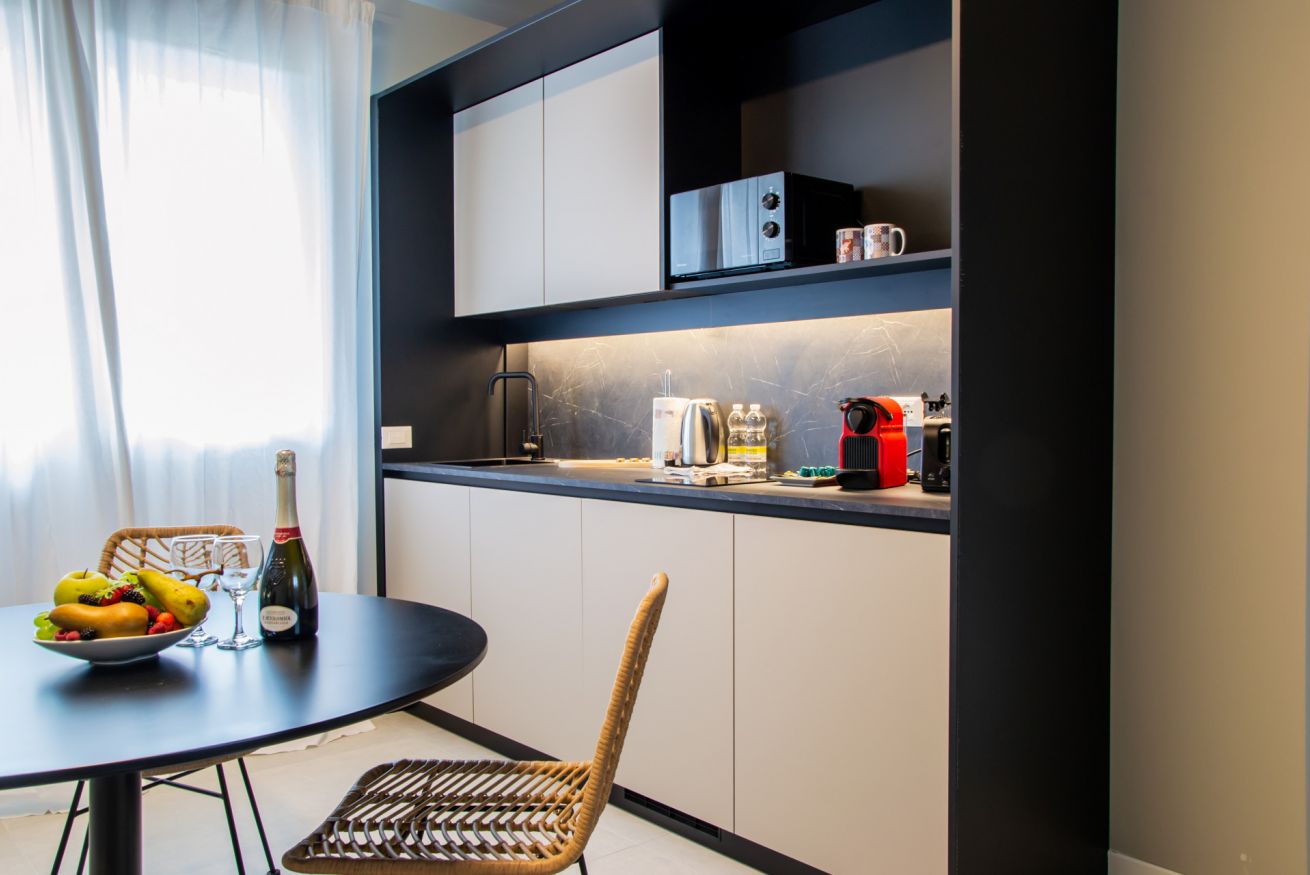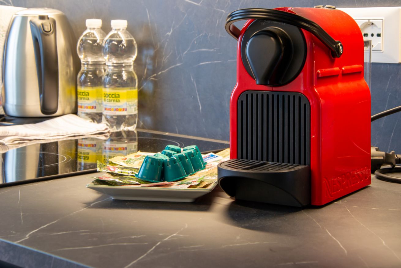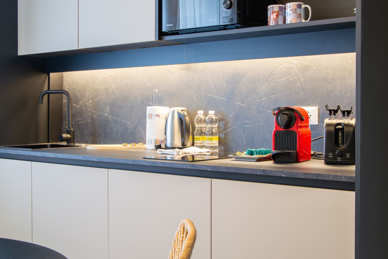 La cucina, completamente attrezzata, include forno, forno a microonde, macchina da caffè Nespresso, tostapane e bollitore, offrendo tutto il necessario per preparare pasti in autonomia. Situato al piano terra, l’appartamento garantisce facile accesso e comfort.